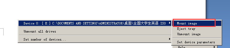 菜单选项依次点击mount image(加载光盘镜像文件),选择要加载的光盘文件(ISO格式)即可。
